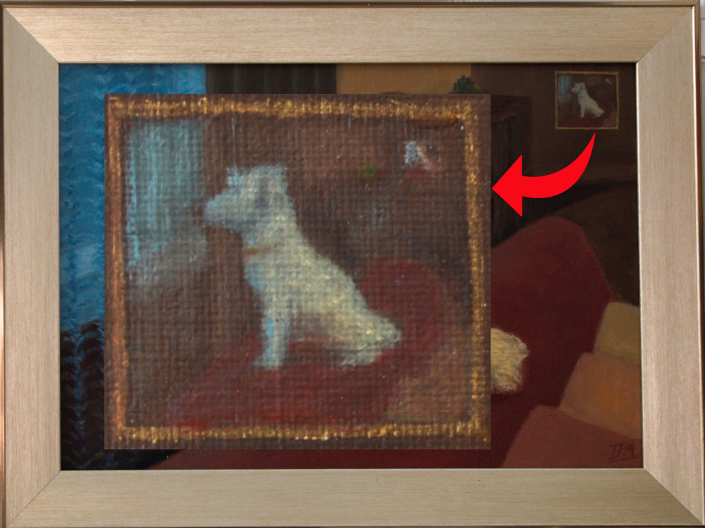 This was a small (A4) picture but I painted a thumbnail painting of the painting on the back wall in the painting, which also includes a tiny painting of the painting on the back wall of that painting.